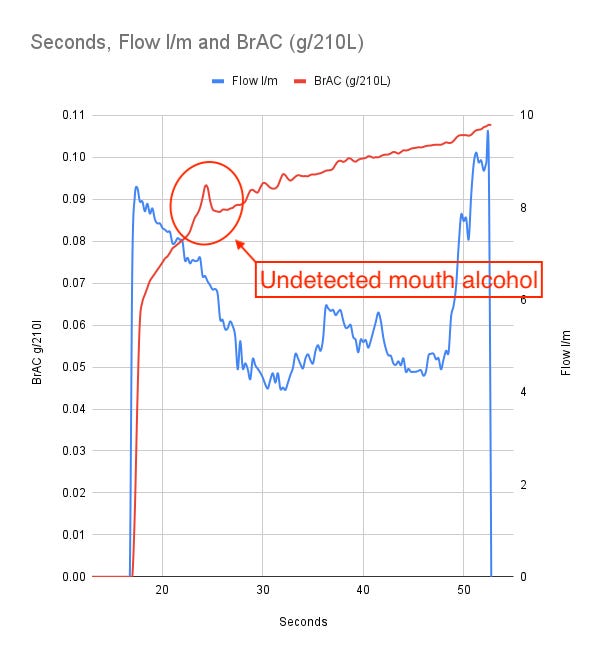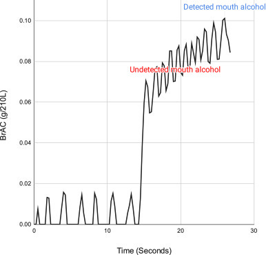 Case 2: An individual who burped multiple times during the pre-test observation period and reported feeling stomach contents refluxing into their throat. The expirogram showed a negative-going slope—a classic sign of mouth alcohol. Again, the instrument missed it.